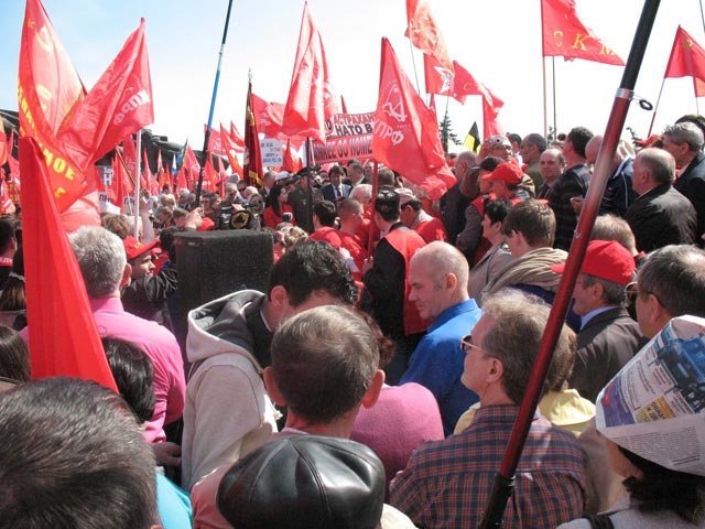 В областном УВД ИТАР-ТАСС заявили, что на площади собрались около тысячи человек. Многие из пришедших - в майках с надписью "Стоп НАТО!". Лозунги собравшихся гласят: "Нет базе НАТО!", "Не позволим торговать родной землей!", "Не допустим НАТО в сердце Родины".