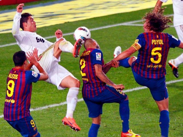 Первая половина матча прошла в обоюдоострых атаках обеих команд. Несмотря на привычно высокий процент владения мячом у "Барселоны", закрепившийся за ней уже с самого начала встречи, первый опасный момент создали все же игроки "Королевского клуба" - на 5-й минуте Криштиану Роналду удался отличный удар головой, после которого голкиперу хозяев Виктору Вальдесу пришлось потрудиться, чтобы вытащить мяч из-под перекладины.