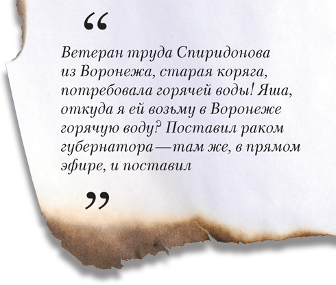Я в курсе. А нужна выдающаяся! В вас дети должны играть, как в Чапаева! Ну хорошо: детство, материнская любовь — это мы придумаем… Юношеская романтика — турпоходы там, первая любовь, вся херня… — тоже без проблем. А вот давайте мы с вами, Петр Петрович, подумаем, что делать с ГБ.