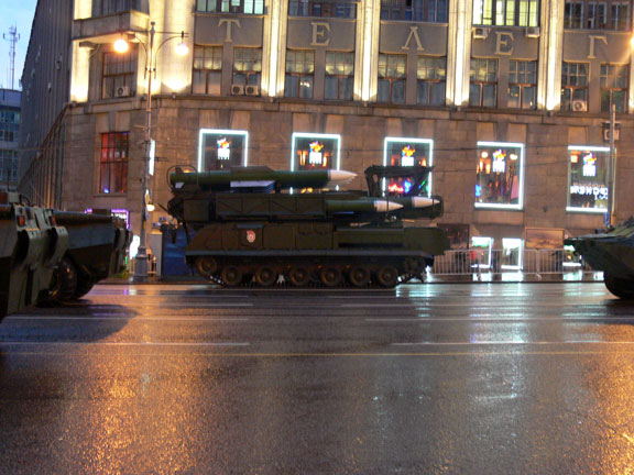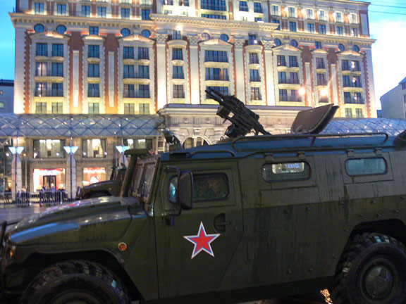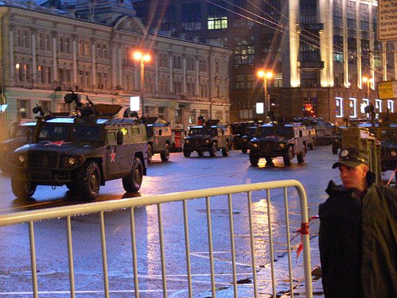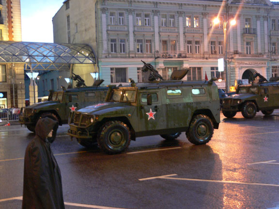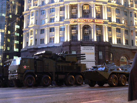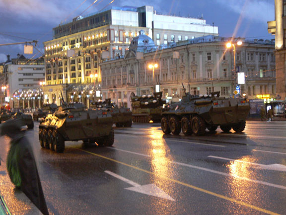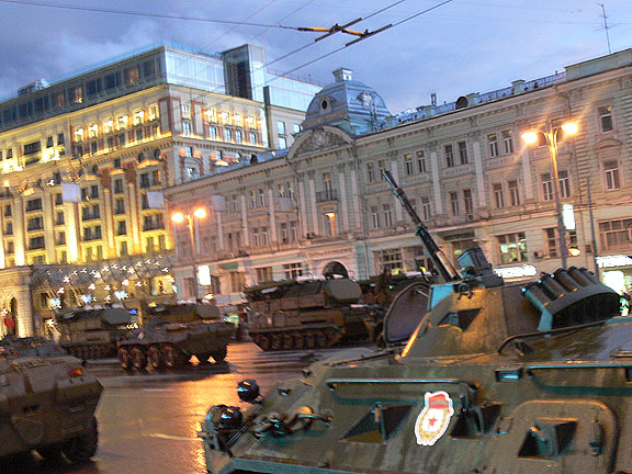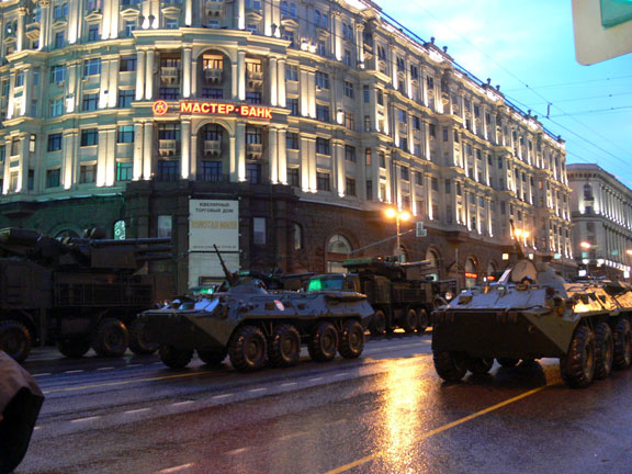 Причина понятна — репетиция парада на Красной площади, по какому случаю с шести вечера перекрыли целый ряд центральных столичных улиц. В параде с недавних пор участвует бронетехника и ее надо для репетиции как-то доставить на Красную площадь — вот и перекрывают улицы для прохода танков.