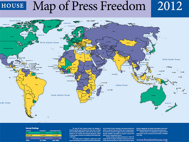 По данным доклада, ситуация со свободой прессы в мире в 2011 году впервые за восемь лет не ухудшилась. Из 197 рассмотренных в исследовании стран и территорий статус "свободных", с точки зрения деятельности СМИ и доступа к ним граждан, был присвоен 66 государственным образованиям (33,5%), "частично свободными" названы 72 страны (36,5%), а 59 стран (30%) были зачислены аналитиками FH в категорию "несвободных".