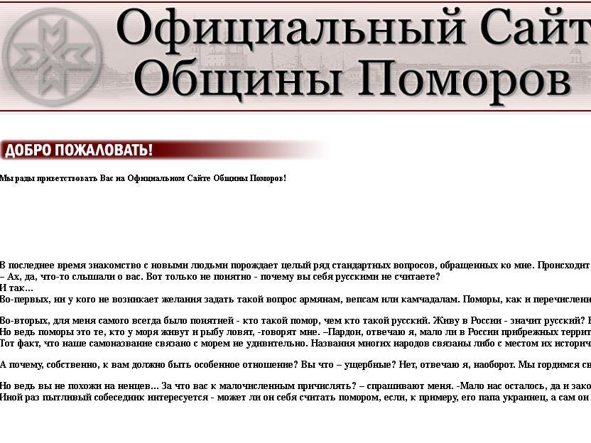 Фрагмент гланой страницы сайта Общины поморов Мы публикуем интервью нашего постоянного автора Льва Усыскина с архангельским историком Дмитрием Семушиным о том, как на наших глазах в России происходит формирование нового этноса.
