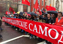 В Москве на Пушкинской площади в полдень началось протестное шествие "Марш Победы". Как сообщает "Новая газета", активисты с белыми ленточками и колонна Левого фронта стартовали от Пушкинской площади на расстоянии от согласованного шествия КПРФ. Они прошли к Лубянке, скандируя "Россия без Путина", "Победили Гитлера, победим и Путина" и "Это наш Кремль". Участники шествия развернули большой красный баннер "Долой президентское самодержавие". За колонной следовали омоновские автобусы и автозаки.