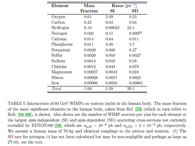 Невероятное открытие сделали ученые (физики-теоретики) из Университета Мичигана. Для этого они исследовали так называемые вимпы (WIMP или Weakly Interacting Massive Particle, то есть "слабовзаимодействующие массивные частицы") - гипотетические частицы темной материи, которые должны были появиться с рождением Вселенной. Исследователи знали, что вимпы с большей вероятностью будут "встречаться" с атомами кислорода и водорода. А так как организмы людей состоят в основном из воды (а молекула воды состоит из двух атомов водорода и одного кислорода), у людей есть масса шансов повстречаться с гипотетическими "вимпами". Некоторые типы этих частиц "посещают" тело человека массой 70 килограммов 10 раз в год, другие – сотни тысяч раз в год, передают "Вести".