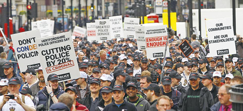 Бобби бастуют В Лондоне прошла самая крупная за историю Англии и Уэльса забастовка полицейских — на улицы вышли 30 тыс. офицеров. Бюджет на полицию сокращают на 20%, что предполагает сокращение примерно 16 тыс. человек. Часть демонстрантов (ровно 16 тыс.) были в черных кепках, остальные — в белых, чтобы показать, как много полицейских будет уволено.