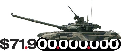 Военные расходы России в 2011 году подсчитал Стокгольмский международный институт исследования проблем мира СИПРИ (SIPRI). По объему трат на вооружение наша страна находится на третьем месте в мире после США и Китая ($711 млрд и $143 млрд соответственно). Зато Россия — абсолютный лидер по темпам военных расходов: за минувший год они выросли на 9,3%, что впервые позволило ей обойти в рейтинге СИПРИ Великобританию и Францию.