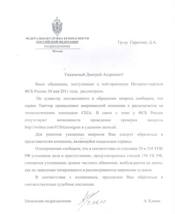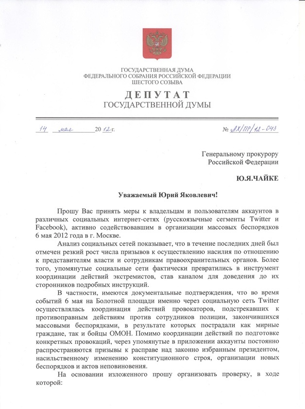 Запрос на имя генпрокурора Чайки с просьбой привлечь к ответственности владельцев некоторых твит-аккаунтов — это ваша личная инициатива или позиция "Единой России"?