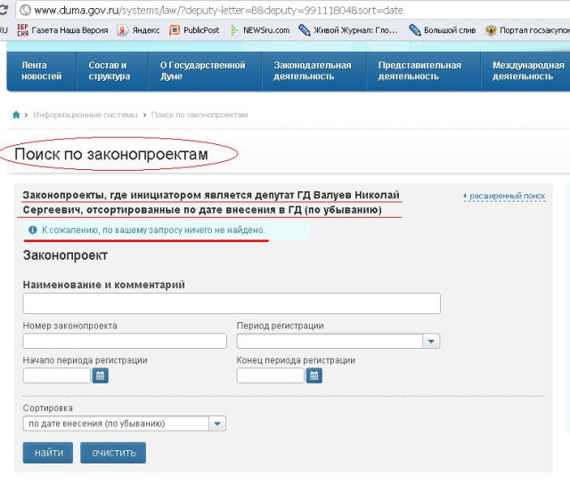 Совсем забыл, ведь депутат Государственной думы не для этого избирается! Может быть, волшебный поисковик Госдумы расскажет о том, сколько законодательных инициатив г-н Валуев явил миру за прошедшие полгода депутатства? Давайте же скорее посмотрим: