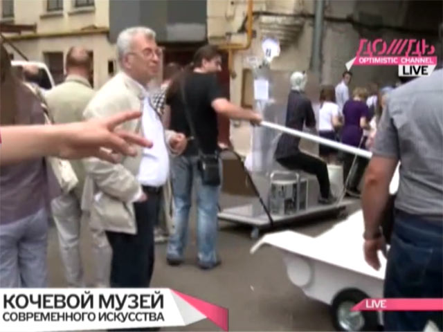 Около 25 московских художников в субботу в рамках масштабной акции "Ночь в музее" решили провезти свои картины на тележках по московским бульварам. Акция была согласована с властями Москвы, получила название "Кочевой музей современного искусства", а по факту стала продолжением "контрольной прогулки" писателей, только менее многочисленным. В ходе акции был порван плакат с Pussy Riot, в остальном обошлось без происшествий.