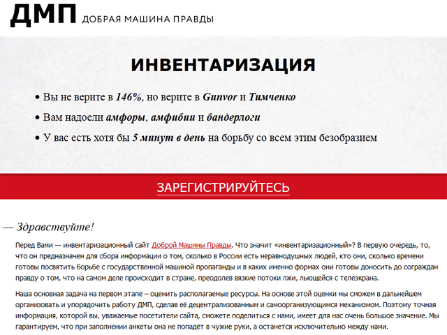 "Тут и Путину конец", - заключает блоггер. Он призвал максимально распространять информацию о ресурсе и регистрироваться на нем, в том числе для того, чтобы проверить, выдержит ли он наплыв посетителей. Опасения оказались не напрасны - в данный момент сайт "Доброй Машины" работает со значительными перебоями.