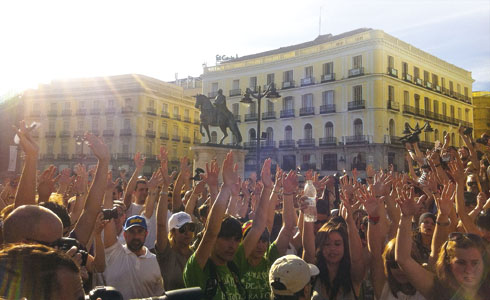 ” Впрочем, испанцы не просто живут в палатках и поют под гитару. На этой и других мадридских площадях ежедневно собираются рабочие группы по вопросам образования, медицины, экологии, политическому и экономическому устройству современного государства: расписание встреч вывешивается в интернете.