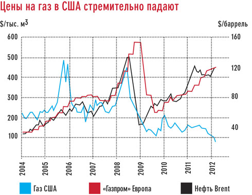 Америка отказалась от импорта и обеспечивает себя сама за счет растущего рынка сланцевого газа. В 2011 году в Америке бурили в поисках сланцевого газа 1300 скважин в месяц. В результате газ в США за последние три года упал в цене на 80% и сейчас стоит дешевле, чем в России, отмечает Юдаева***В апреле цены на газ в США составляли $70 за 1000 кубометров, в России — около $100 за 1000 кубометров..