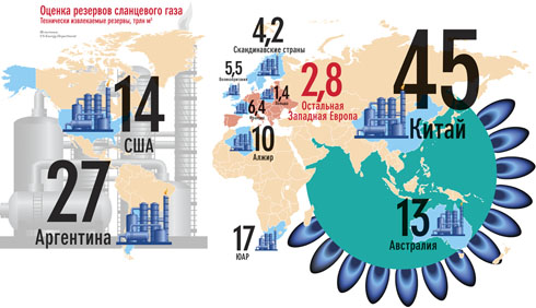 В 2014 году начнется коммерческая добыча сланцевого газа и в Британии. Могли бы начать и раньше, но откачка газа из сланцев привела на острове к двум землетрясениям — в апреле и мае прошлого года. Чиновники приостановили добычу, установив предельный максимум (землетрясение силой 0,5 балла), при котором добыча должна прекращаться. Видимо, рост сейсмической активности при добыче газа из сланцев неизбежен — он происходит из-за попадания в сланцы воды, песка и химикатов (которые нужны, чтобы произвести гидроразрыв пласта и извлечь газ). Но больше всего сланцевого газа, утверждают американские исследователи, в Китае — 45 трлн кубометров**По данным китайского министерства земли и природных ресурсов — 25,1 трлн кубометров.. Цель Китая — добывать ежегодно 6,5 млрд кубометров сланцевого газа к 2015 году и 60–100 млрд — к 2020 году. Чтобы довести разведанные месторождения до коммерческой добычи, потребуется 3–5 лет. К добыче будут допущены частные китайские компании, иностранным же китайцы предлагают инвестировать в проекты, руководят которыми местные фирмы. „