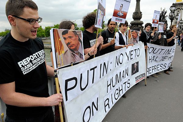 В Париже, где у Путина был запланировал официальный ужин с новым президентом Франции Франсуа Олландом, прошли сразу две акции. С утра правозащитники из Amnesty International прокатились по городу на электрических самокатах, на которых были установлены плакаты с изображением российского президента. Под портретом Путина указывалось его меню: фрикасе из попранных свобод, суп-пюре из продажи оружия под соусом "Башар Асад" и чеченский десерт с сиропом из убитых мирных жителей.