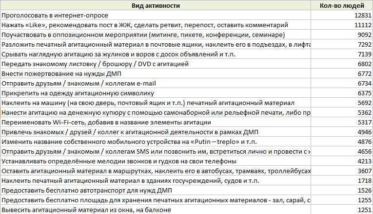 Сюрпризов, как видите, не произошло. Самыми популярными оказались традиционные виды агитации. Ну и отлично, мы точно знаем, что в течение пары дней эффективно распространим любой агитматериал, который можно распечатать на домашнем принтере (листовку, газету и тд) тиражом не менее 100 тысяч экземпляров. Будем доводить эту цифру до миллиона.