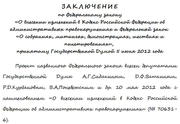 Скажете, неуместно начинать «аналитику» со слов товарища Саахова из «Кавказской пленницы»? Но ничего другого не шло мне на ум, когда я обнаружил на официальном сайте Госдумы написанное от руки (!) заключение правового управления аппарата Совета Федерации. Заключение, которое сейчас уже открывается на сайте в исправленном, печатном виде, посвящено законопроекту «О внесении изменений в Кодекс Российской Федерации об административных правонарушениях и Федеральный закон «О собраниях, митингах, демонстрациях, шествиях и пикетированиях»», прохождение которого побило все скоростные рекорды. Чего ж удивляться тому, что юристы верхней палаты не успели набрать текст на компьютере, да так и выставили его на всеобщее обозрение. О причинах торопливости говорить не стану, они слишком известны, скажу о некоторых ее последствиях.