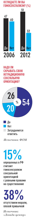 В России люди состоявшиеся свою нетрадиционную ориентацию скрывают. В лучшем случае они могут себе позволить не подтверждать и не опровергать те слухи, которые ходят в их ближайшем окружении. «Это такой высший предел честности, — говорит Игорь Кочетков, директор петербургской ЛГБТ-организации «Выход». — Россия все еще остается патриархальным обществом, в котором сексуальная ориентация и сексуальная идентичность — один из способов социальной стратификации. Чтобы сделать карьеру в России, надо быть женатым. Это подтверждается всеми социологами, и в этом нет секрета». Последние исследования ФОМ говорят, что половина жителей нашей страны относится к представителям сексуальных меньшинств с неодобрением. Не осуждает их треть опрошенных. Толерантность выше среди москвичей и жителей других крупных городов, среди людей с высшим образованием, а также женщин и молодежи.