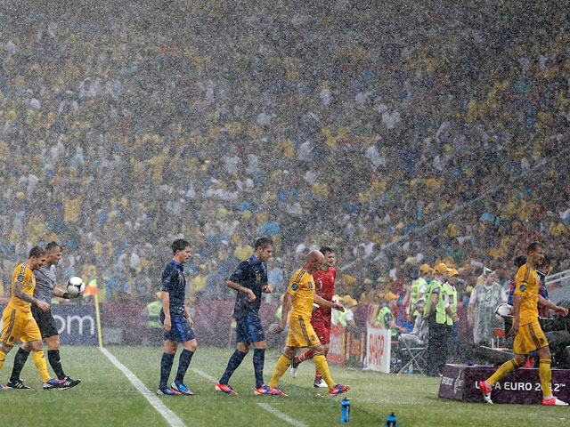 Матч второго тура группового этапа чемпионата Европы по футболу между сборными Украины и Франции в Донецке был прерван уже на пятой минуте из-за сильнейшего ливня. Спустя час игра была возобновлена и закончилась уверенной победой "трехцветных" со счетом 2:0.