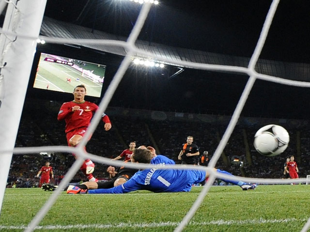 Португальцы приняли "вызов" и стали создавать в атаке один момент за другим. Хорош был Роналду. В первой половине игры у него было четыре замечательные возможности забить, из которых он использовал только одну: на 28-й минуте футболист "Реала", убежав на рандеву со Стекеленбургом, отправил мяч точно в цель - 1:1.