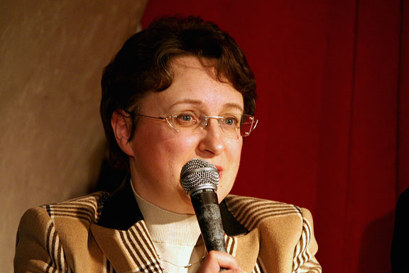 Татьяна Литвина. У меня вопрос - по поводу того, что женщина в искусстве абсолютно равна с мужчинами, спорить мы не будем. В науке, в предпринимательстве женщины начали продвигаться, а вот в политике - я просто немножечко прокручиваю назад - вы закончили на этом свой ответ. Почему-то не только у нас, но и у вас, и в Европейском союзе очень противятся, и если взять примеры - и Тэтчер, и Меркель, и наши Екатерины, и Елизавета в Англии, - да женщины очень конструктивны в политике, очень. И я активный пользователь фейсбука - женщины более миролюбивы, более конструктивны, более четко себя преподносят. Все, что я вижу на политическом поле, если уж появляются у нас в Думе, то, мне кажется, мужчины подбираются по принципу чем дурнее. А уж если женщины, то это просто кошмар Божий, какая-то кукла. Меня интересует, в данном случае вы борцы за женское право, почему так мало продвигаете женщин в политику?