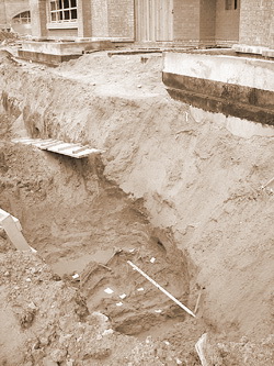 | | Траншеи с останками погибших в «Шталаге-372» уходят под фундаменты свежепостроенных жилых домов. Раскопки были прекращены по решению застройщика (ООО «ЦЭОН» – Центр эксплуатации объектов недвижимости, Санкт-Петербург.). Фото: Алексей Старков |