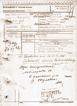 | | Первая страница личной карточки заключенного концлагеря «Шталаг-372» Анатолия Ширинкина в Пскове. |
