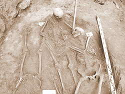 | | Открытые во время недолгих раскопок останки советских солдат потрясают своим драматизмом: по положению некоторых останков можно предположить, что людей закопали живыми. Раскопки были прекращены по решению застройщика. Перезахоронить силами поисковой организации «След Пантеры» удалось только 243 человека. Фото: Алексей Старков |