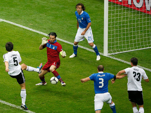 В итоге распечатать ворота Джанлуиджи Буффона немцам удалось лишь в компенсированное ко второму тайме время с пенальти, назначенного за игру рукой Федерико Бальцаретти.