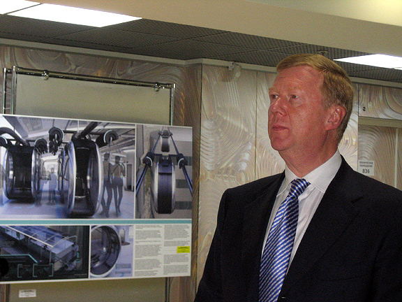 Анатолий Чубайс на фоне работы Дмитрия Погорелова«Москва без пробок: Общественно-личный транспорт».Третье место занял проект студентки Российской Академии Художеств Алины Романовой – «Строительство энергоэффективных домов на каркасе из полимер-древесного композитного материала».