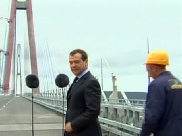 В ходе визита во Владивосток Дмитрий Медведев открыл новый мост на остров Русский, который стал одним из крупнейших вантовых мостов в мире. Его центральный пролет 1104 метра в длину, высота над зеркалом воды 70 метров. Строительство обошлось в 34 млрд рублей. Премьер отметил, что мост уже стал визитной карточкой Владивостока.
