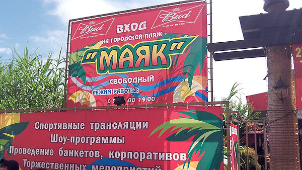 Пляж "Маяк" начинается забором, за которым теснятся искусственные пальмы диско-бара "Малибу" и декоративные хижины кафе "Котон". Формально путь к морю свободен, но на деле вам придется пройти мимо барных стоек и столиков.