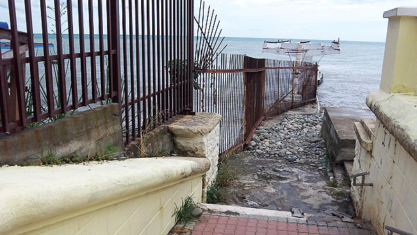 Не стали исключением и сочинские пляжи. 100 километров гальки и прибоя только с высоты кажутся неделимым целым. Если приблизить оптику, то станет видно, что береговая полоса — не монолит, а, скорее, пирог или рулет, нарезанный неравномерными кусками: выходы к морю четко поделены между санаториями, домами отдыха и пансионатами. Забор соприкасается с забором, края решетки, заведенной глубоко в море, усажены грубо приваренными пиками и штырями и покрыты мазутом — "чтобы не лазали".