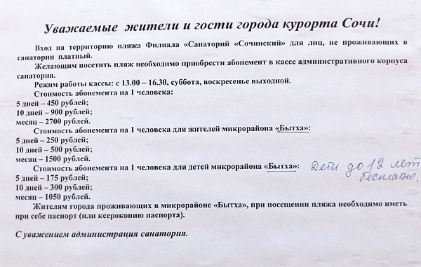 В этот раз осознание собственной правоты не помогло — там, где подземный переход выныривает из-под железнодорожного полотна, упираясь в санаторский турникет, стояли два человека в форменных рубашках ЧОПа и с рациями в ладонях. Один из них сразу пояснил, что раньше на пляже был беспорядок, а теперь будет порядок. Второй указал на висящий на стене прейскурант. Жители Бытхи, ближайшего к санаторию микрорайона, по сравнению с приезжими, действительно имели льготы: теперь, чтобы попасть к морю, они должны будут заплатить всего полторы тысячи рублей в месяц. Жители остальной России, желающие пройти к морю, раскошелятся уже на 2700 рублей в месяц. Похожая ситуация повторилась и на соседнем санаторном пляже. В конце концов, мне просто захотелось понять — где в Сочи можно искупаться в море бесплатно.
