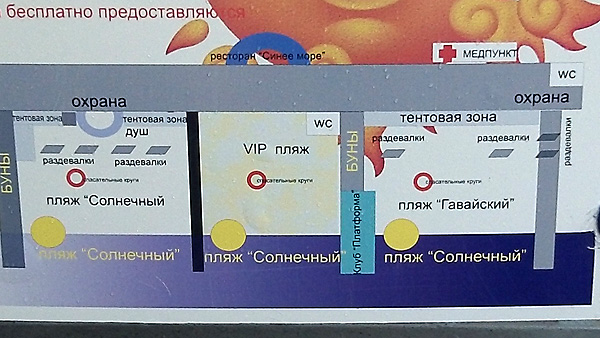За "Жемчужиной" начинается пляж "Солнечный", пузырящийся некоей "VIP-зоной": лежак здесь стоит уже 500 рублей, а уютная, скрытая пологом беседка на трех человек — 3000 рублей.