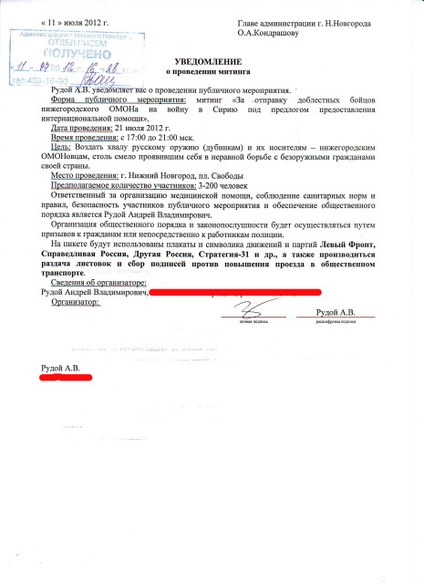 Произошло то, что и должно было произойти по всем законам логики - нанаши небезуспешные попытки вернуть протест в центр Нижнего Новгорода, администрация стала отвечать поспешными контрмерами. Всё мигом встало на свои места: чиновники, как ужаленные, начали писать ответы на наиболее опасные уведомления, ответы эти стала вновь подписывать заместитель главы администрации М.М.Холкина, а не её и.о. Подозреваю, что после успешно проведённого нами пикета в поддержку политзаключённых, кое-кто кое-кому за стенами Нижегородского Кремля устроил хорошую головомойку, ввиду чего чиновники стали с утроенным рвением давать ответы на поступающие кипы уведомлений о готовящихся публичных мероприятиях.