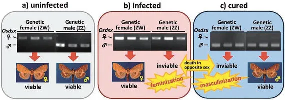 Ученые работали со щетинконогим мотыльком Ostrinia scapulalis, зараженным штаммом вольбахии wSca. Они проследили за развитием личинок и соотношением полов в потомстве здоровых мотыльков, самок, зараженных Wolbachia, и самок, избавленных от инфекции. У изначально здоровых насекомых выводятся из личинок и самки, и самцы. Линии инфицированных мотыльков поддерживают, скрещивая зараженных самок со здоровыми самцами. Всё потомство таких пар инфицировано, самцы погибают в ходе эмбрионального развития или на личиночной стадии. Самок можно излечить от бактерии, добавляя тетрациклин в корм личинкам. При этом всё равно выживают только особи женского пола, но они свободны от Wolbachia. Однако в потомстве исцеленных самок соотношение полов нарушено: на сей раз выживают только самцы.