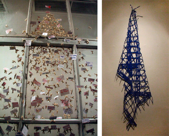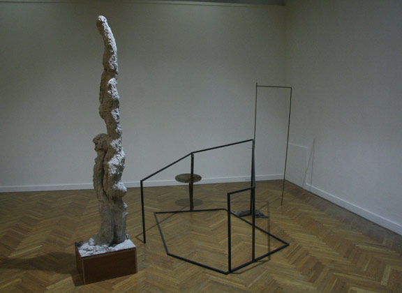 Ирина Дрозд и Александр Ефоемов "Тленность" Ей пришлось просмотреть и отсеять, как она пишет в каталоге «невнятные рассуждения о существовании внеземных цивилизаций, красочные агитки о грядущем глобальном потеплении, простодушные натюрморты, обнаженные девичьи тела в сладостной, «салонной» интерпретации». То, что действительно имело отношение к современному искусству, она распределила по пяти направлениям – «Инсталляция в пространстве» в ГЦСИ, и на четырех этажах зала на Ермолаевском переулке – остальные. Там есть раздел «Формалисты» - к ним, в отличие от Беккер, Селина отнеслась с юмором. Две работы, грека и голландца, оба из которых работают, по их собственным словам, с принципами архитектурного дизайна, она разместила одну над другой, на стене и на полу. Сначала думаешь, что это одно произведение, потом узнаешь, что два разных. Смысла от этого не становится ни больше, ни меньше, ведь и то и другое - просто конструкции из черных палок с претензией на глубокомысленность.