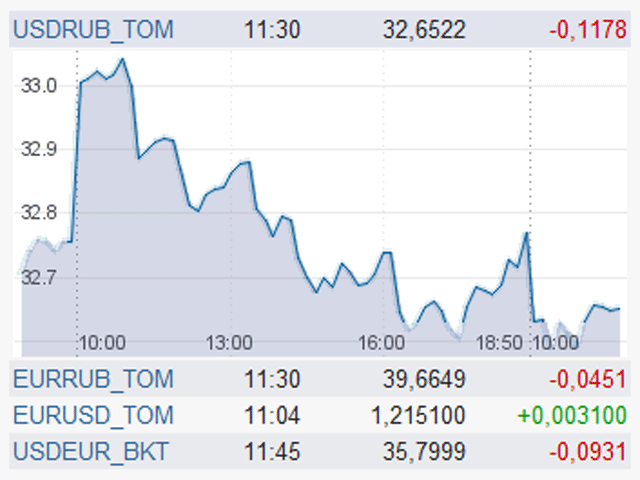 Средневзвешенный курс доллара США к российскому рублю со сроком расчетов "завтра" на торгах единой торговой сессии межбанковских валютных бирж по состоянию на 11:30 по московскому времени, на основе которого происходит процесс курсообразования доллара на следующий день, упал на 34,33 копейки и составил 32,6224 рубля, передает "Финмаркет".