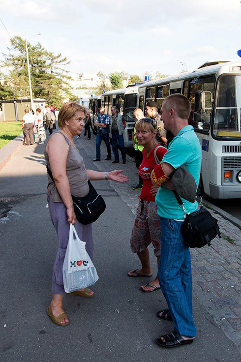 Народная артистка России Татьяна Догилева (слева) проводит агитационную работу с дружинниками, охраняющими митинг в Новопушкинском сквере.