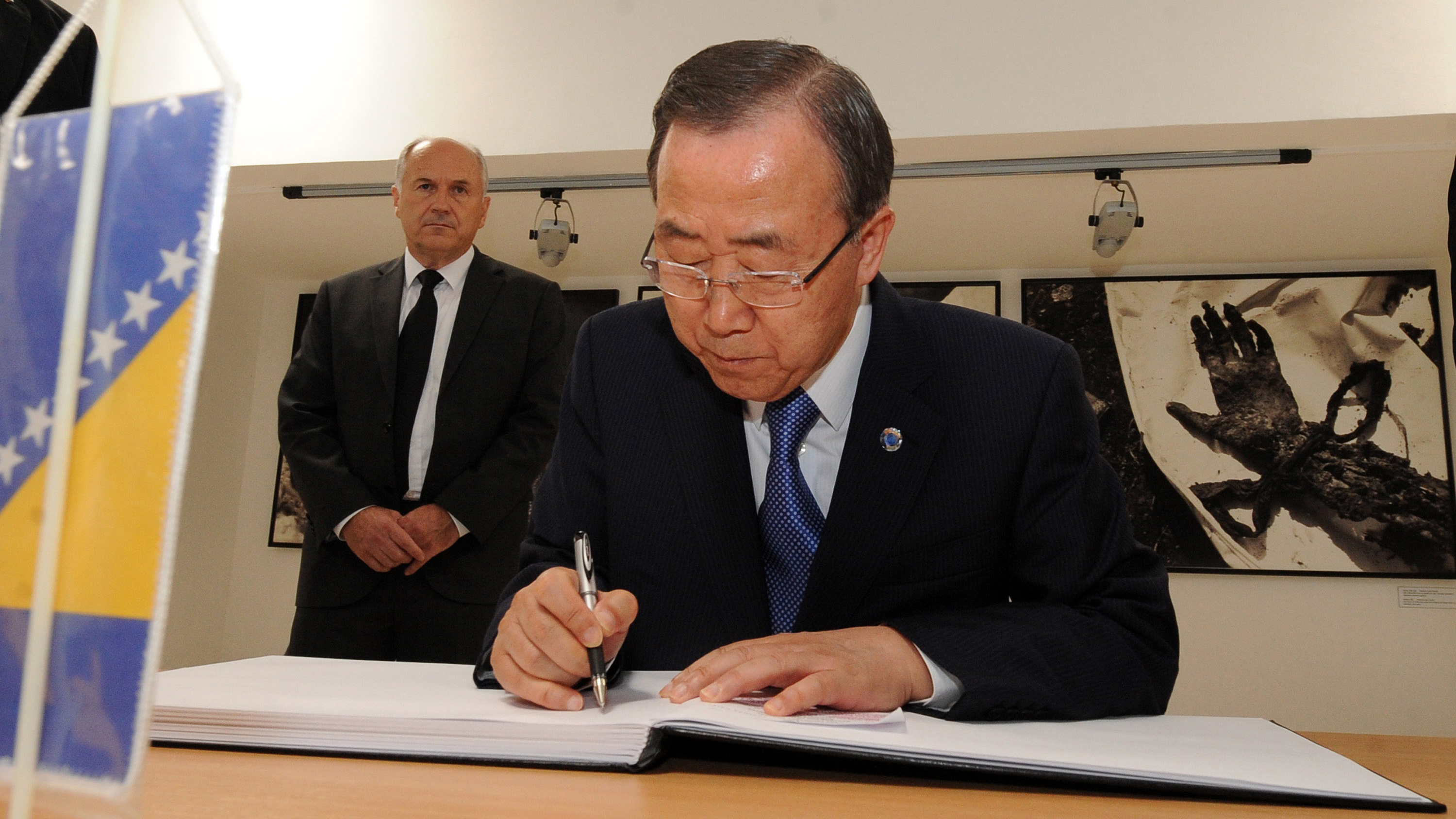 Пан Ги Мун стал первым главой ООН, посетившим место самого жестокого военного преступления в Европе со времен Второй мировой войны.