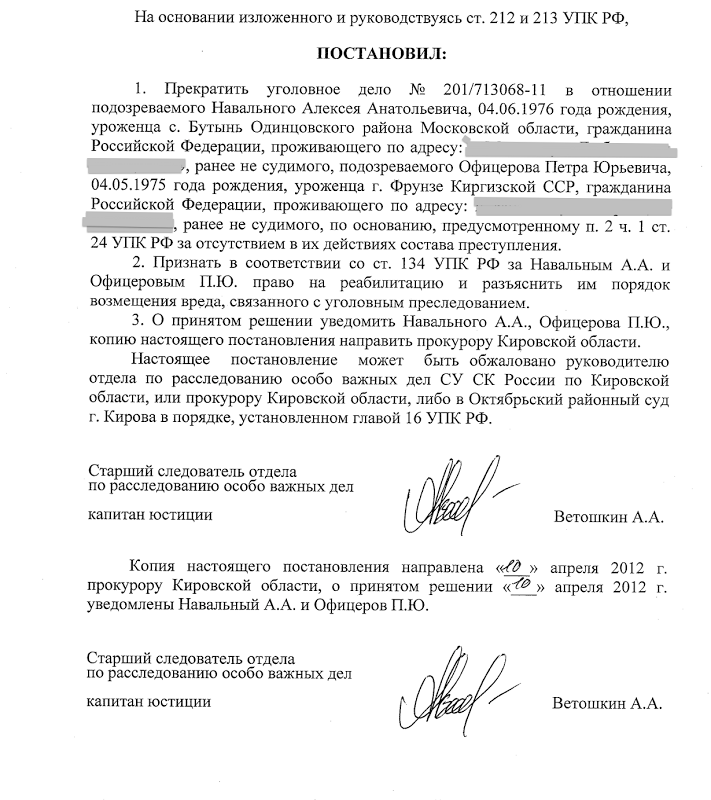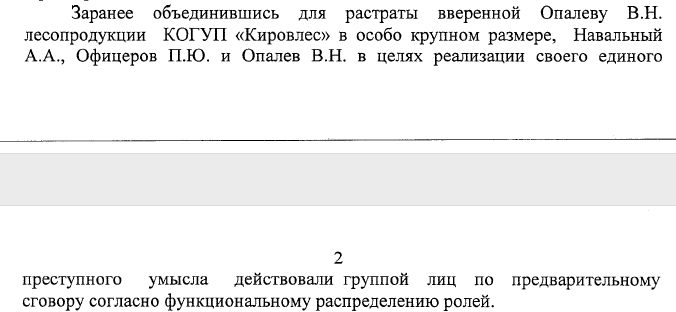 "...дело против адвоката Алексея Навального 3 декабря было передано из Главного управления МВД по Приволжскому федеральному округу в местное управление СКП. По версии следствия, будучи советником губернатора Кировской области, Навальный "путем обмана и злоупотребления доверием" принудил экс-директора ГУП "Кировлес" (Учредитель — департамент лесного хозяйства Кировской обл.) Вячеслава Опалева заключить невыгодный договор на поставку древесины, который принес предприятию убыток в 1,3 млн руб