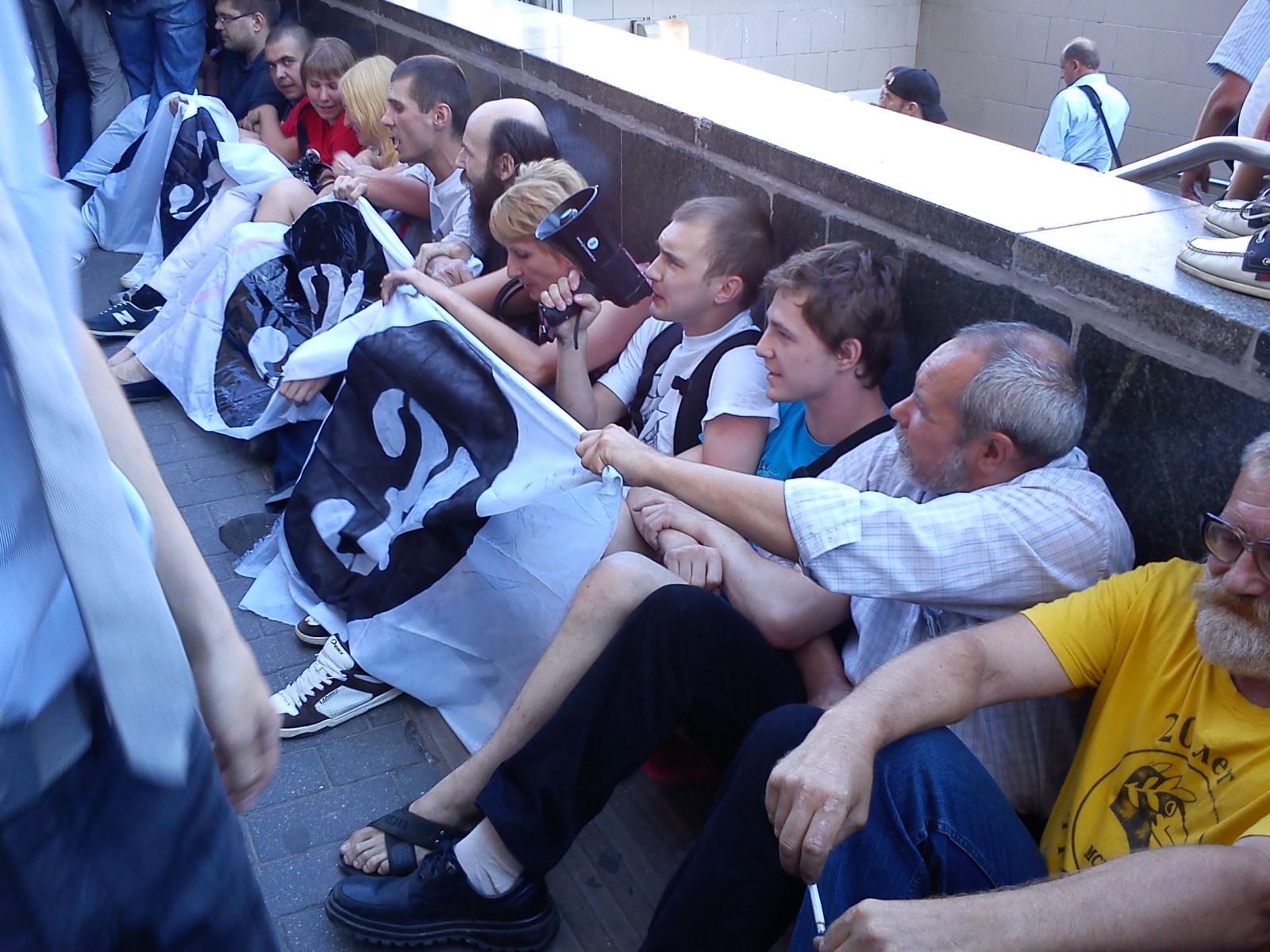 19.50: Другая Россия: Полицейские пытаются затолкать людей в метро, подкрепляя свои просьбы занудными спичами в мегафон о необходимости не загораживать проход
