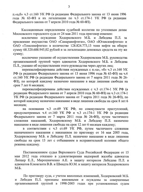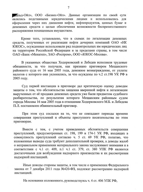 — все остальные доводы жалоб защиты, включая довод о том, что нельзя не применять закон, улучшающий положение осужденных, тоже должны быть рассмотрены судом». (Речь идет о том, что за то время, что шли процессы по «делу ЮКОСа», санкции статей, в частности 174-1 — «отмывание денег» — изменились.)