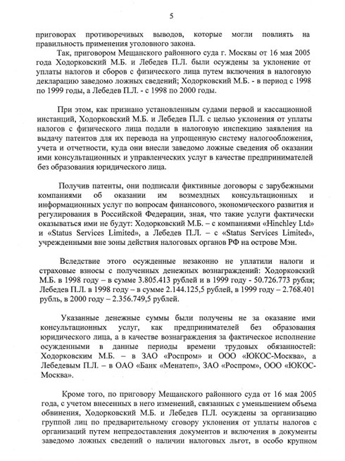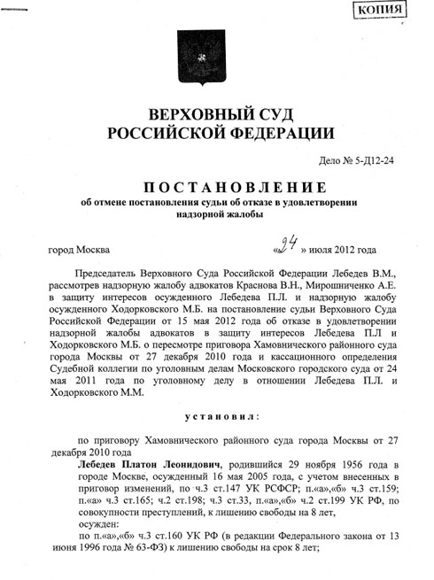 31 июля адвокаты Михаила Ходорковского получили текст постановления председателя Верховного суда Вячеслава Лебедева на их надзорную жалобу. Постановление было вынесено еще 25 июля, но его текст стал известен адвокатам только вчера. Вячеслав Лебедев направил жалобу Михаила Ходорковского и Платона Лебедева на рассмотрение в Президиум Мосгорсуда, сопроводив своими рекомендациями