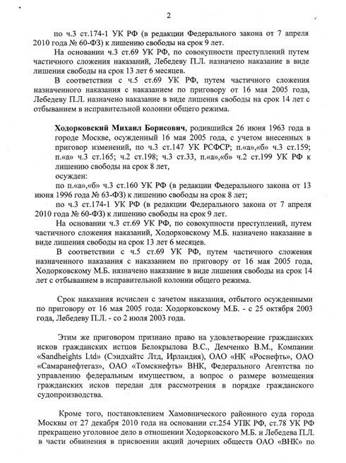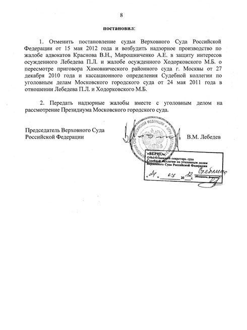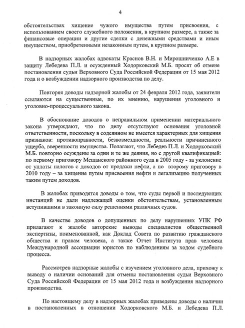 Адвокат Михаила Ходорковского Вадим Клювгант, комментируя это постановление на сайте пресс-центра Михаила Ходорковского, отметил: «Сущностная часть постановления председателя Верховного суда, содержащая тонкий намек на наличие у него своей позиции, отличной от хорошо известной предыдущей позиции всех судов — «все законно и обоснованно», сводится к двум коротким абзацам на странице 7. Их смысл, насколько его удалось постигнуть, состоит в следующем: