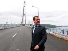 Первый сданный в эксплуатацию мост - на остров Русский - приняли тоже с месячной задержкой. 2 июля его открыл премьер Медведев, но на следующий день мост закрыли. Повторно мост открывал мэр Владивостока Пушкарев. Скорость движения на мосту решили ограничить 40 км/ч. Такой скоростной режим Пушкарев объяснил тем, что останавливаться на мосту будет нельзя, поэтому некоторые автомобилисты могут пытаться замедлить движение, чтобы сфотографировать уникальное сооружение.
