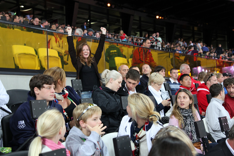 Ладно, зашли, наконец, на стадион. Там уже вовсю бегают и прыгают. Если оглядеться, за Россию болели только мы и сотрудница Мегафона. Мы были окружены американцами, британцами, китайцами и австралийцами. Шумели как могли :)