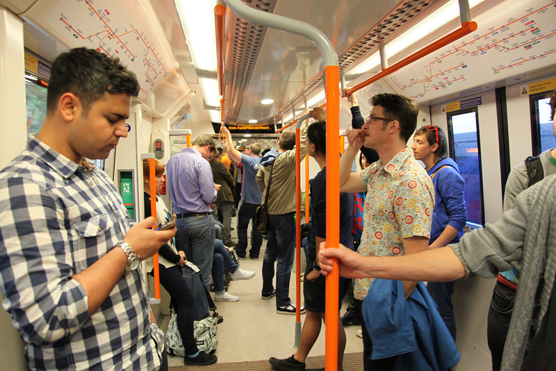 Так вот - на фото час-пик в двух остановках от Олимпийской Деревни, куда в тот вечер направлялось тысяч 100 человек лишних - 80 на стадион и еще как минимум 20 в другие места типа Велодрома и Акватик Центра. В конце, когда все эти люди едут домой, в вагоне чуть больше народа, но Наталья все равно сидела.
