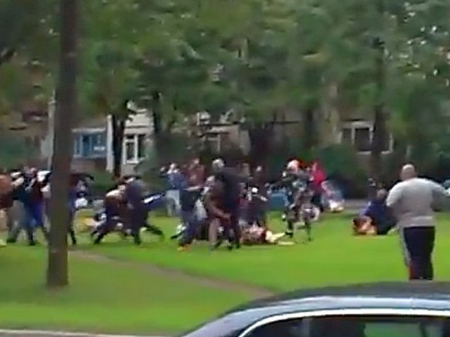 На видео видно, как одна колонна идет на встречу другой, затем фанаты сталкиваются стенка на стенку. Молодые люди валят друга на газон, машут кулаками - судя по записи, победу в "товарищеской встрече" по кулачному бою одержали хозяева. Принцип fair play, однако, соблюден не был: видно, как питерские "музыканты" строем добивают лежащего на траве полуголого "гладиатора".