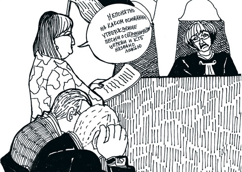 З0.07.12. Прокурор Никифоров спрашивает потерпевшую Сокологорскую: «Является ли слово «феминизм» грубым?» Потерпевшая: «В храме — да».